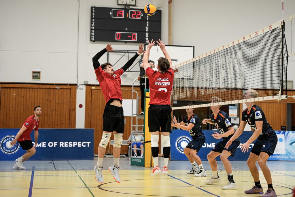 Im dritten Satz konnte sich Mühldorf zu Beginn wieder mit 3:7 absetzen. Doch nach einer Auszeit, stabilisierte sich das Karlsruher Sideout und mit Simon Lieb am Aufschlag konnte sich das Team auf 7:8 heran kämpfen. Nicht lange dauerte es jedoch bis Mühldorf auf 9:14 weg zog und das Trainerteam bereits zur zweiten Auszeit greifen musste. Diese zeigte Wirkung und dieses Mal wurde Mühldorf beim Stand von 13:15 zur Auszeit gezwungen. Doch Karlsruhe holte weiter bis zum Ausgleich bei 17:17 auf. So kam es im dritten Satz zur ersten engen Crunchtime. Bis zum Stand von 23:23 blieben beide Teams stabil im Sideout, doch dann konnte sich Karlsruhe mit dem entscheidenden Break, in Form eines Blocks von Dorian Lehmann und Torm Braun durchsetzen und sicherte sich so den ersten Punkt des Spieles.